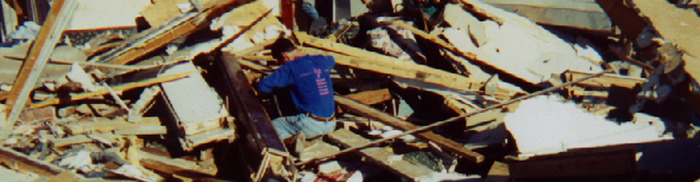 As I left Audra and the kids to search for other survivors, I remember Audra telling me to be ready for the possibility of finding someone dead. I first went across the street from our house. Our neighbor’s house was completely gone. All the walls were down and beat up cars were on top of it. I yelled into the reckage, but heard no response. All I saw was a small toy the boy Jay’s age use to play with. My heart sank. Just then our next door neighbor come up to me and told me he had told them to get out of their house, but they had told him they were going to wait it out. He had driven his family out just before the storm and had circled back behind it to help rescue people. We both thought the family of three was under the mass of wood. (We didn’t find out until 4 days later that they were actually safe at a family member’s house.)